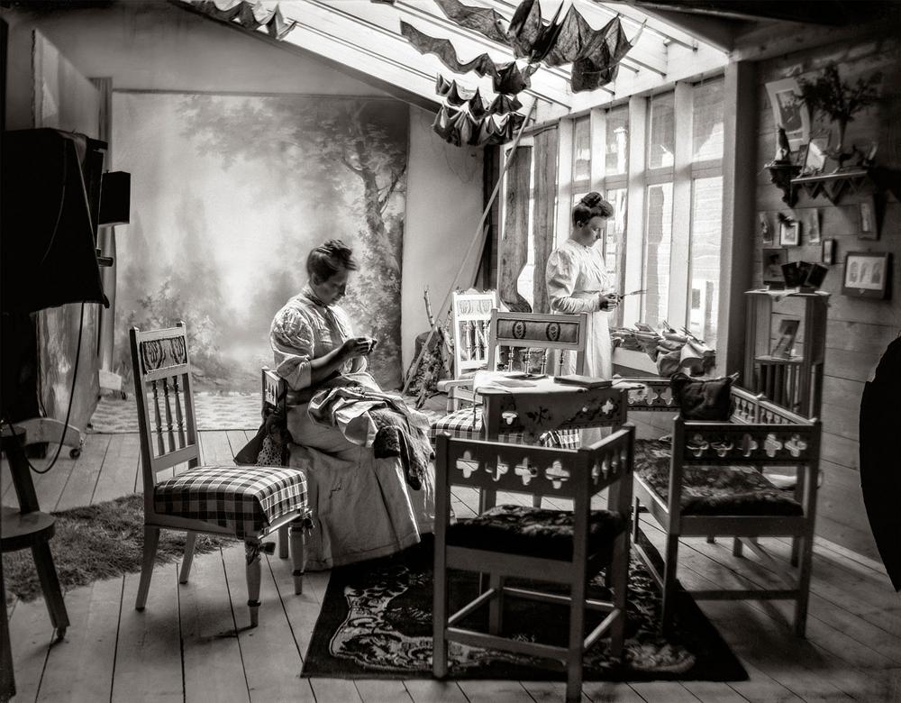 Nuori Hildur Larsson (1882–1952) Mia Greenin (1870–1949) ateljeessa eli valokuvastudiossa. Larsson aloitti valokuvaajan oppinsa hänen valokuvaamossaan Haaparannalla noin 16-vuotiaana 1800-luvun…