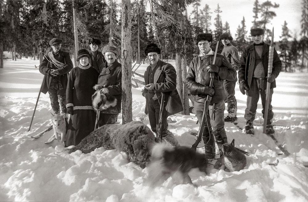 Karhu on kaadettu. Vasemmalta Antti Unga, Hildur Sammallahti, Eevert Unga, metsänhoitaja Elis Sammallahti, tullivartija Pekka Korteniemi, Nordberg Sieppijärveltä sekä Heikki Metsävainio ja Iisakki…