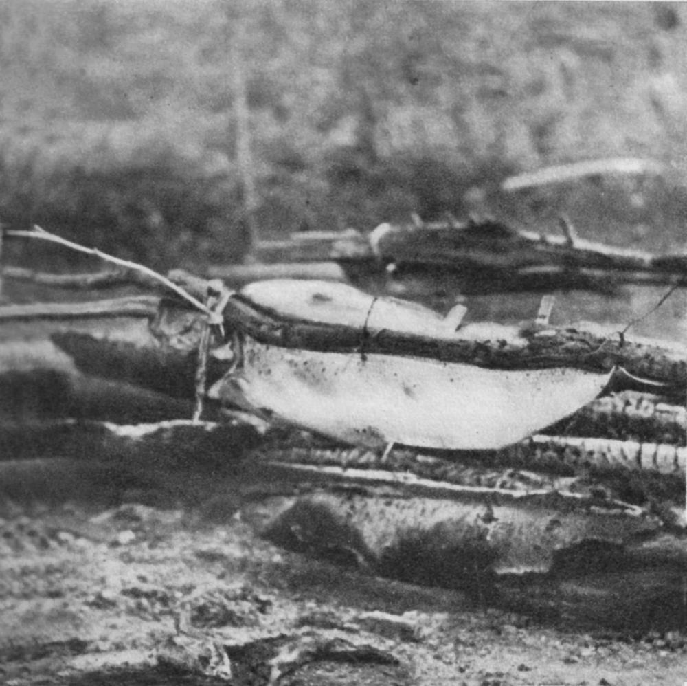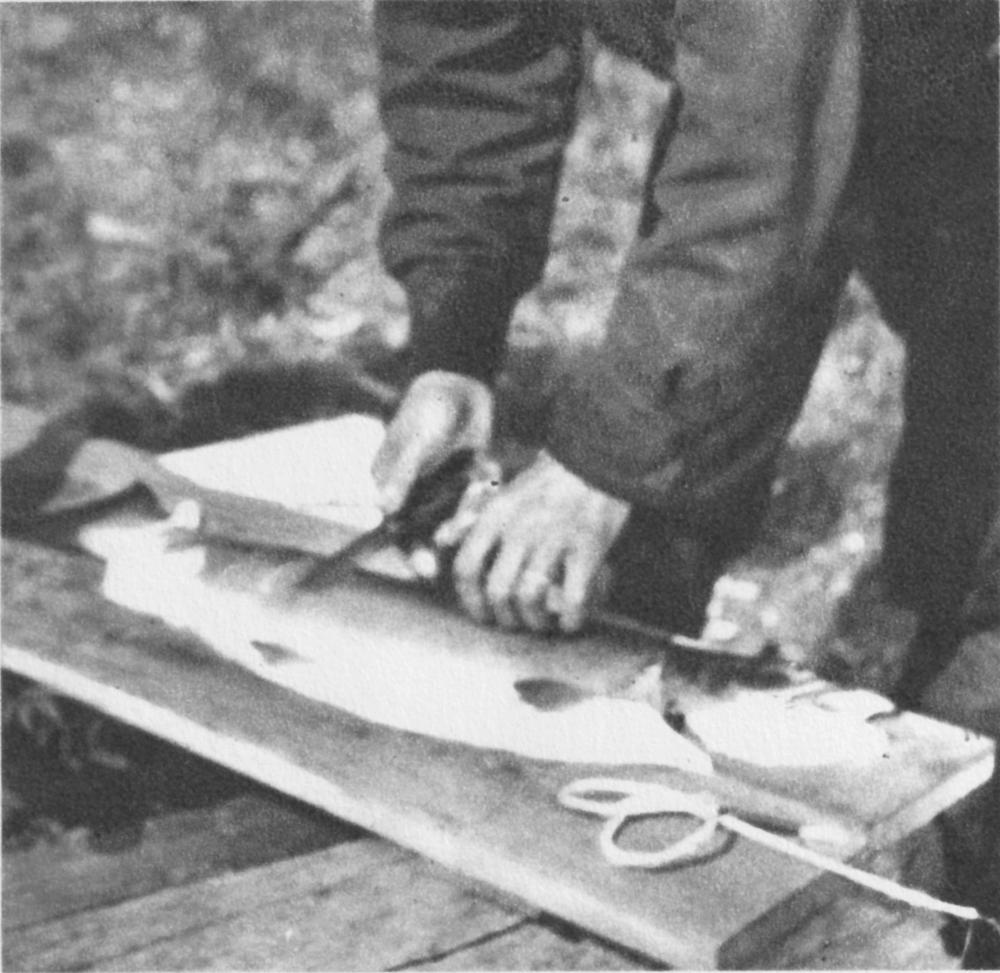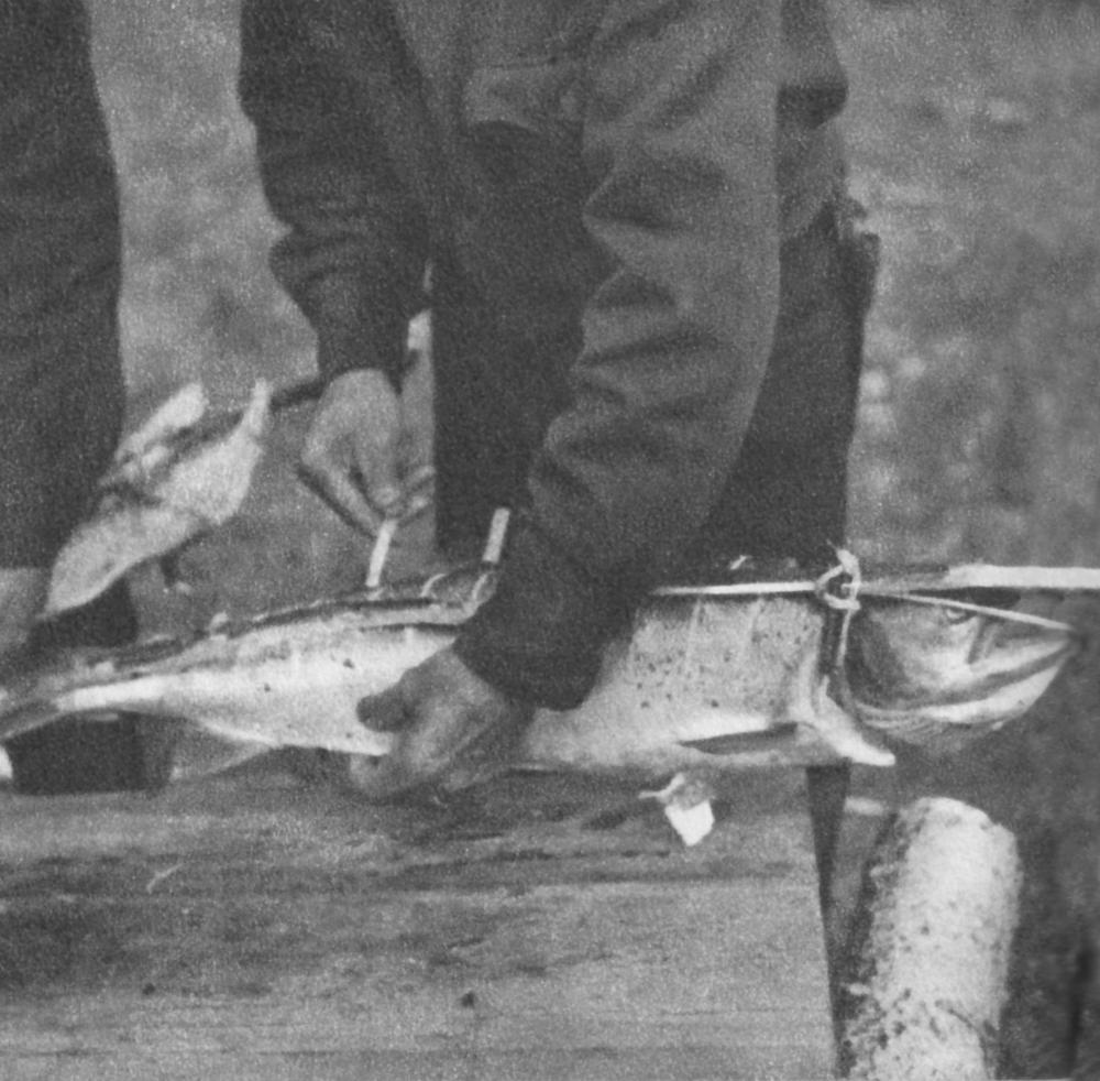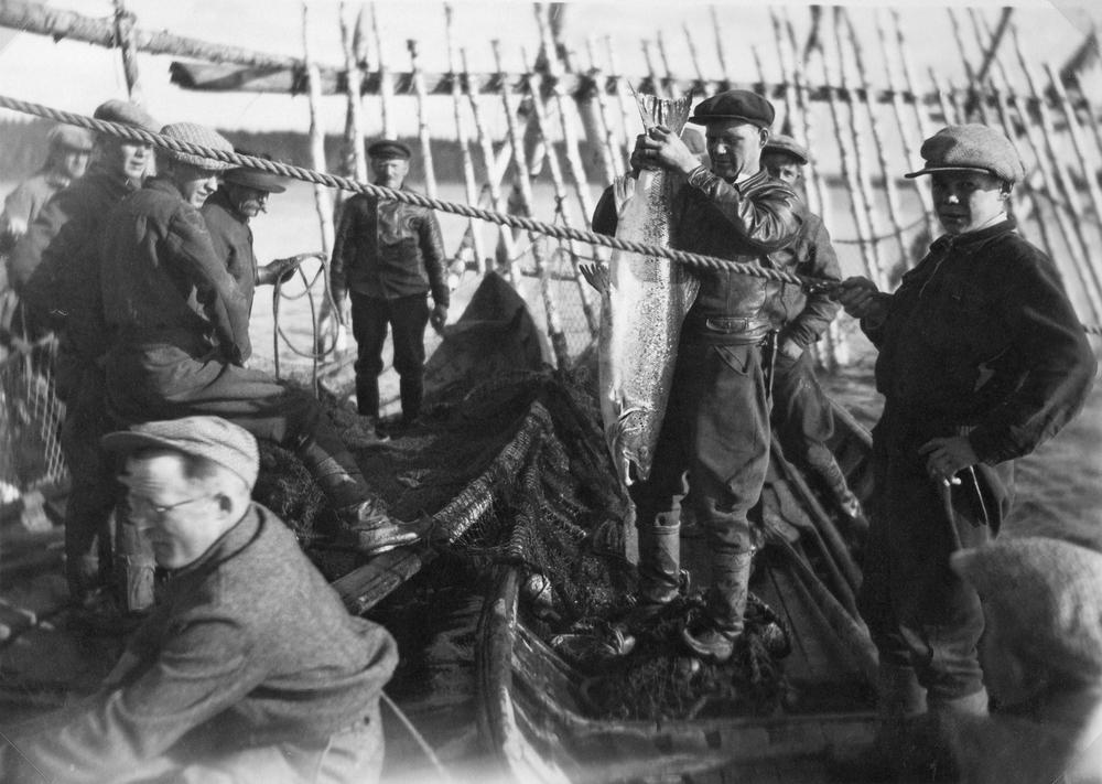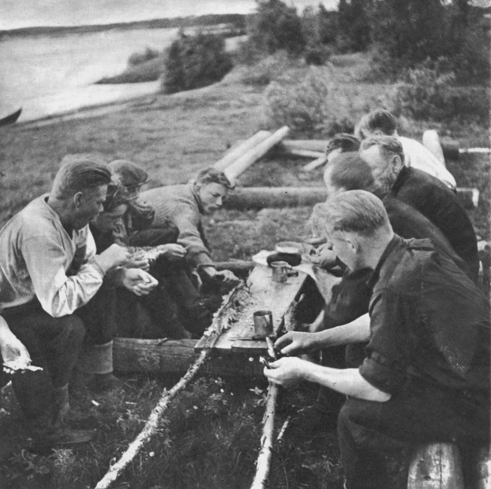 Sivulla 50 on kuva ja siinä seuraava teksti: Paistettu lohi nostetaan *pihdissä ruokapöydälle. Kullekunta käy kahden puolen ja käy sormin kiinni höyryävään lihaan, Vähän suolainen lohen liha on siltään syötynä erittäin ravitsevaa. Aluksi tuntuu, että sitä voisi syödä vaikka kuinka paljon. Mutta yhtäkkiä syöjä tuntee itsensä perin kylläiseksi, eikä halua nielaista palaakaan. Tunne on sama kuin makeaa juustoa tai jauhomuttia kylläksi syötyä.
