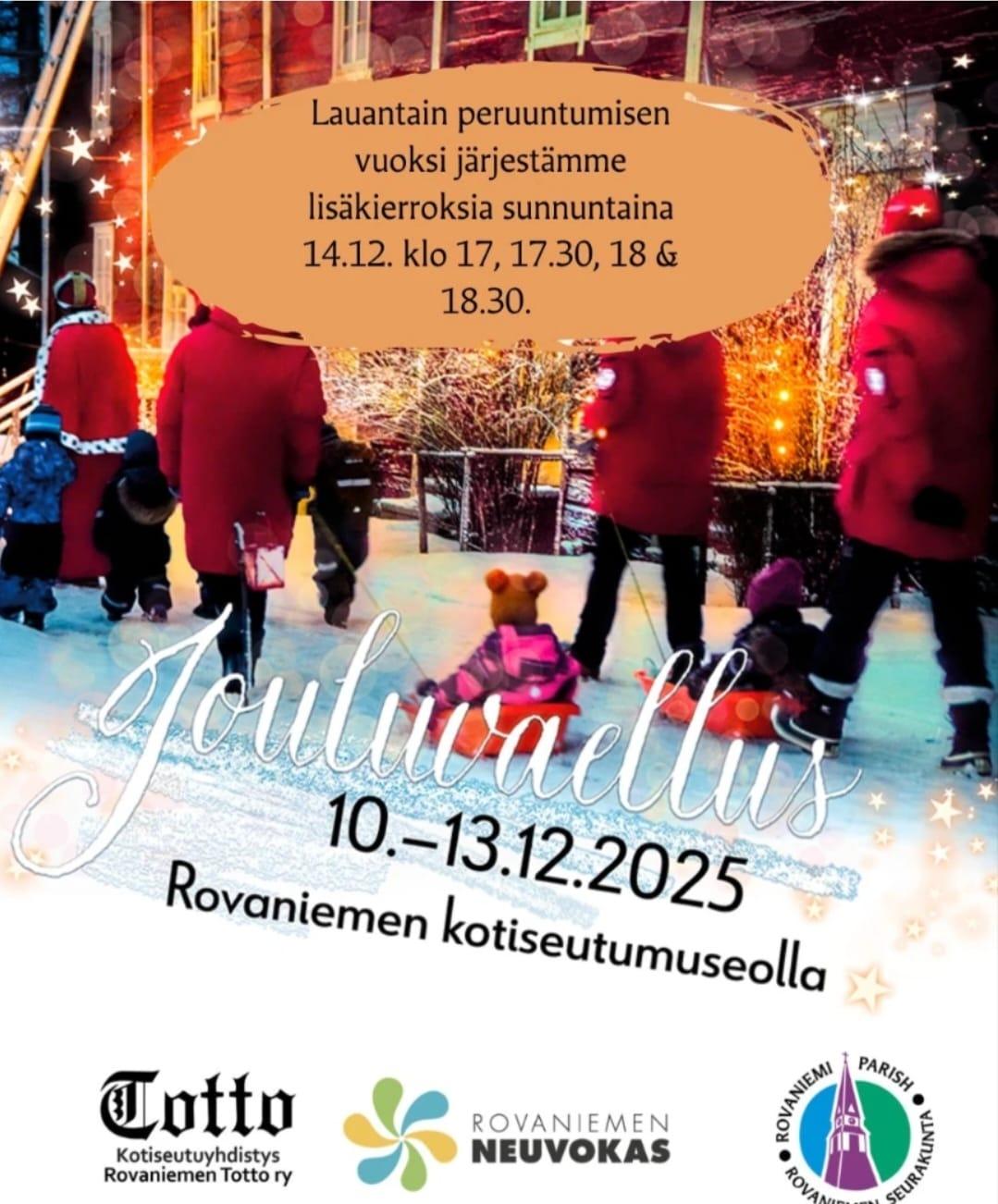 Information about possible cancellations: https://www.rovaniemenseurakunta.fi/tapahtumat
