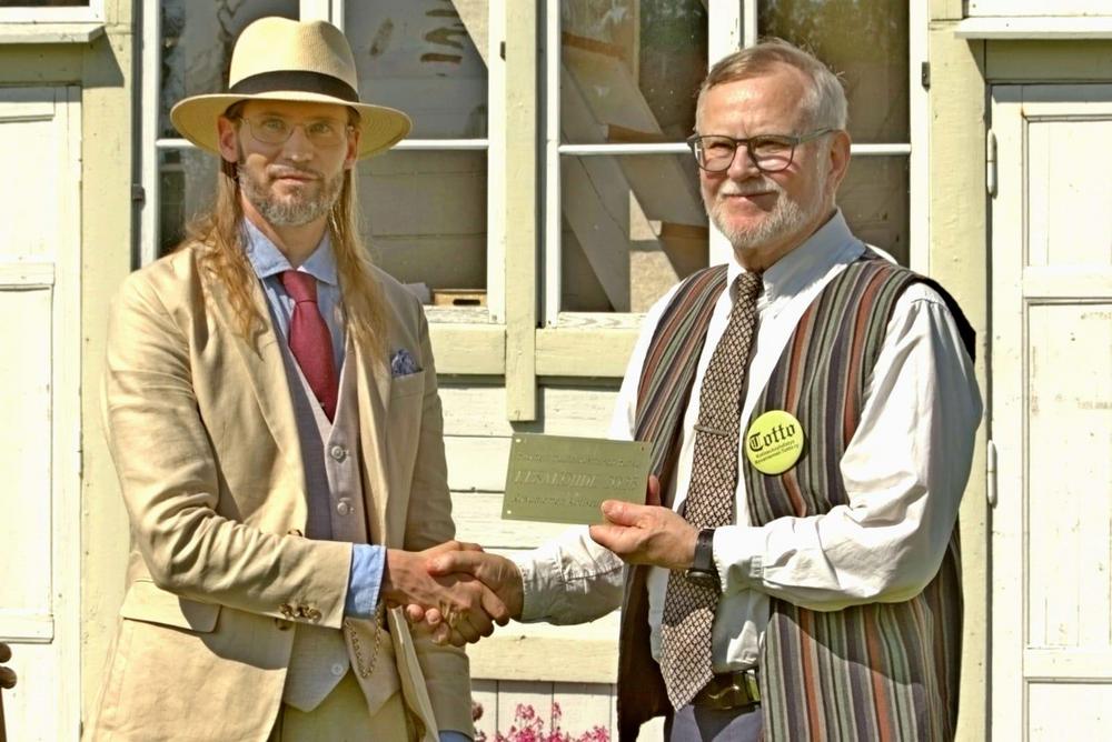 Suomen maatalousmuseo Saran johtaja Lauri Viinikkala tuo tilaisuuteen tervehdyksensä ja luovuttaa Rovaniemen kotiseutumuseolle Vuoden käyntikohde -kilven.