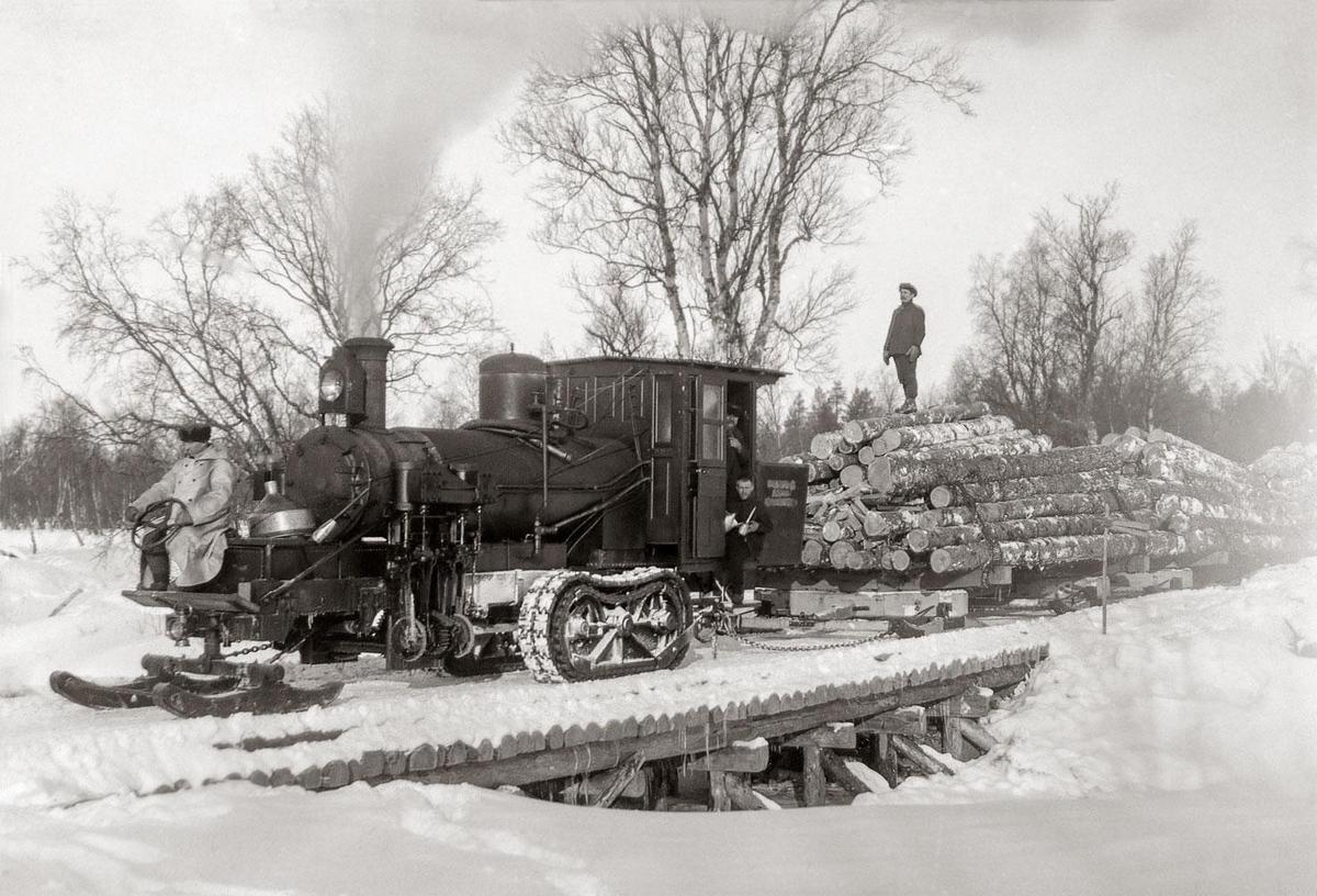 Nuortin konesavotan veturi Savukoskella. Hildur Larsson oli puutavarayhtiö Kemiyhtiön luottokuvaaja, ja hän kuvasi tämän ”Samperin” eli Kemiyhtiön metsäpäällikkö Hugo Richard Sandbergin veturin ylittämässä Sotajoen siltaa. Sandberg oli koneellistumisen ihailija; Amerikasta tilatun veturin mukana tuli myös erikoisvalmisteisia rekiä. Veturikokeilu ei kuitenkaan tuottanut Kemiyhtiölle toivottua tuottoa. Kuva Hildur Larsson, 1913–1916, LMM.