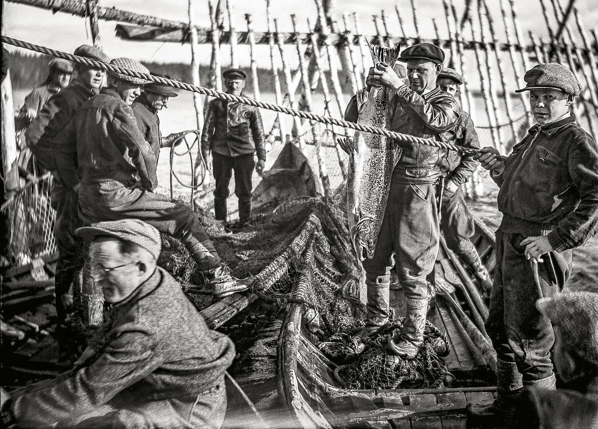Eduskunnan Valtiovarainvaliokunta vieraili Muurolan lohipadolla 7.7.1935, jolloin tämäkin kuva otettiin. Takana koppalakki päässä patoisäntä Frans Tiuraniemi, lohta kannattelee pyrstöstä Reino Tiuraniemi. Muurolan ja Jaatilan lohitalonpoikien rakentama lohipato oli Kemijoen vanhimpia, suurimpia ja tuottavimpia. Ensimmäisen kerran se rakennettiin jo 1600-luvulla. Kemijoen lohi kuoli sukupuuttoon voimalaitosten rakentamisen myötä. Kuva Aatto Aho, Lapin maakuntamuseon kokoelmat.