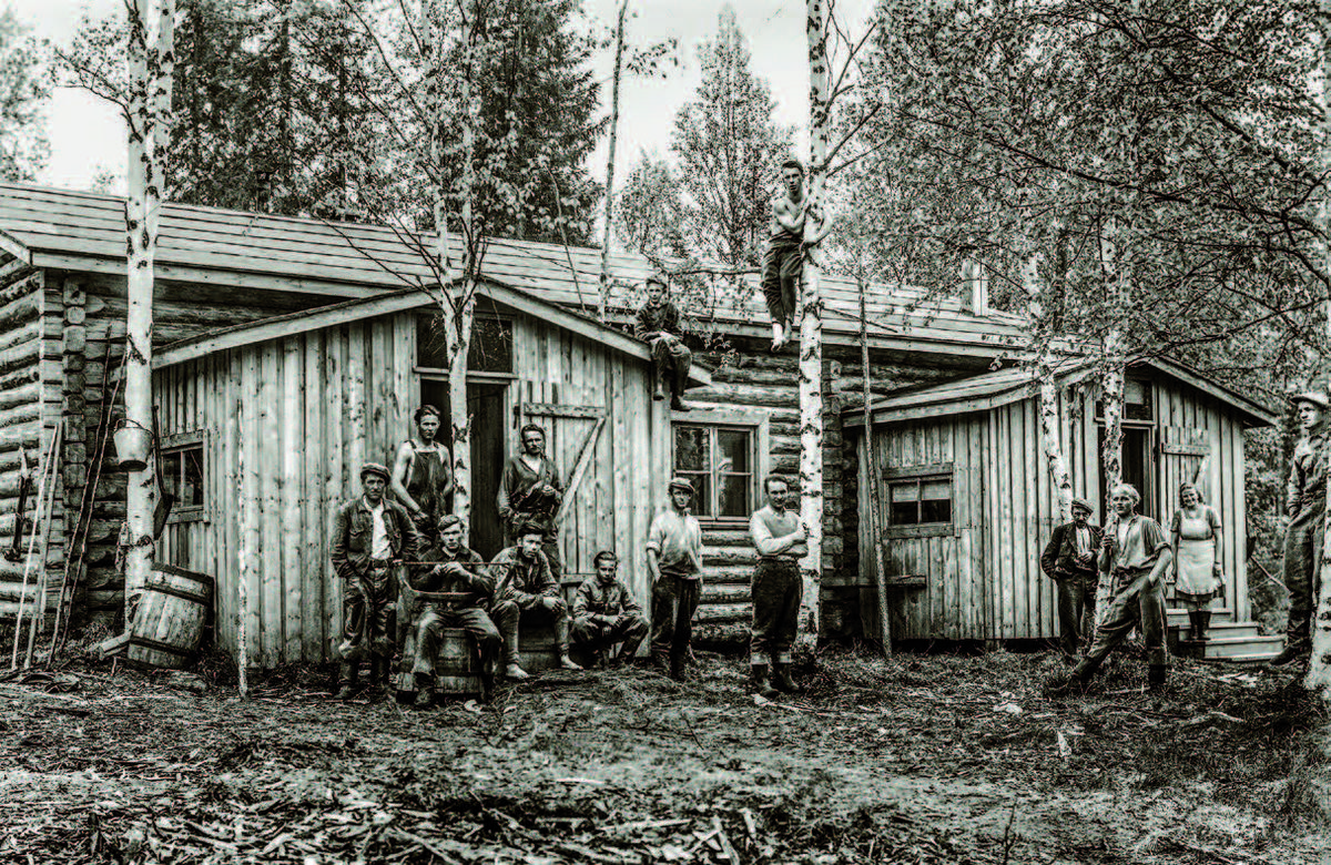 Kuusivaaran savottakämppä rakennettiin 1930-luvulla. Metsätyömiehiä ja kokki kämpän edustalla. Kuva on todennäköisesti otettu 1940-luvun alussa.
